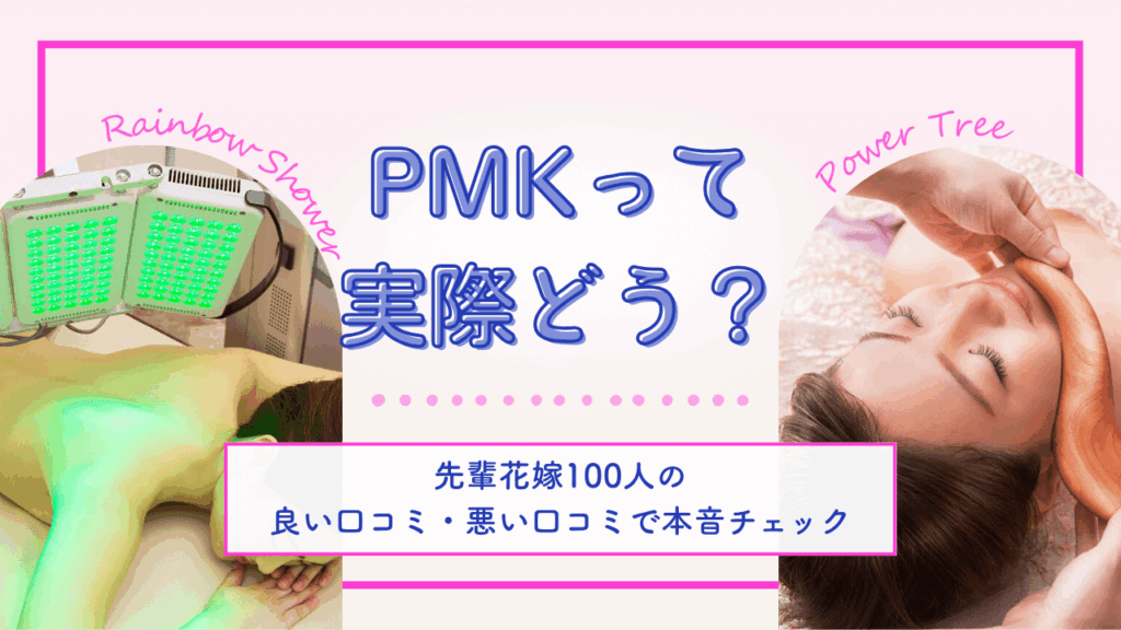 PMKって実際どうなの? 失敗しない? 気になってはいるけれど、通うとなると不安がつきもの。 結婚式前の大事な時期だからこそ、本当に結果が出るのか、勧誘や費用は大丈夫か、通いやすいか…迷ってしまいますよね。 そこで編集部が卒花さん100件以上の口コ... -